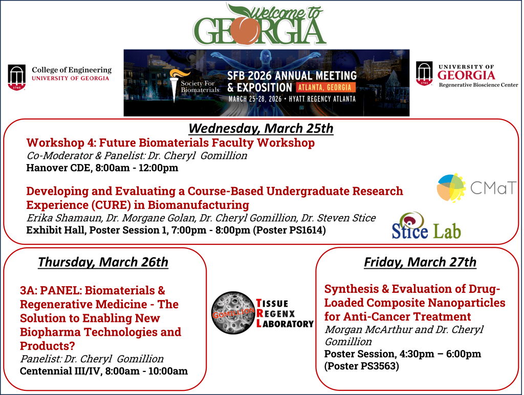 We don’t have to travel far for this one, but that doesn’t change how excited we are for the Society For Biomaterials meeting this week in ATL. It’s always a great time for networking, learning, and connecting with old and new friends at this meeting. Come see representatives from Gomillion Lab throughout the week!