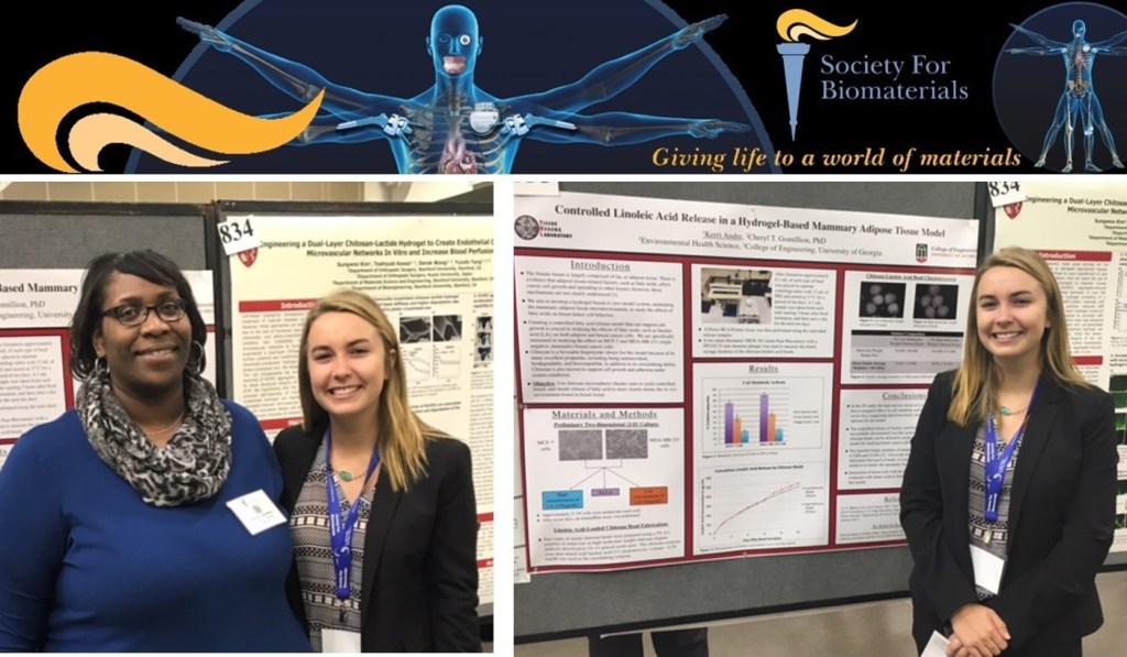 The Society For Biomaterials annual meeting was held this week in Minneapolis, MN. Dr. Gomillion was co-organizer and moderator for a session entitled “Evaluation of Tissue Engineering Constructs”, and undergraduate researcher, Kerri Andre, attended and presented a poster of her work entitled “Controlled Linoleic Acid Release in a Hydrogel-Based Mammary Adipose Tissue Model”
