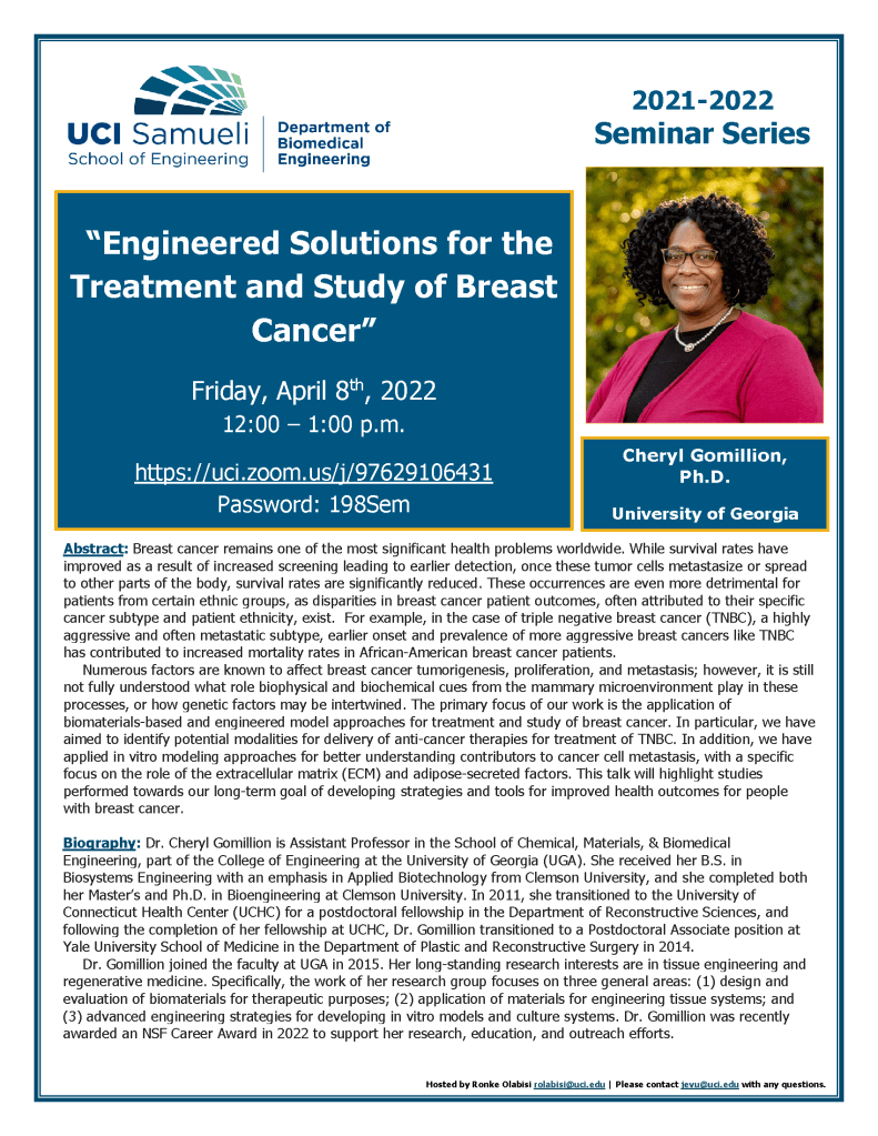 Dr. Gomillion has been invited for a seminar at the University of California – Irvine Department of Biomedical Engineering. Looking forward to the virtual visit!