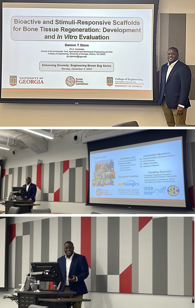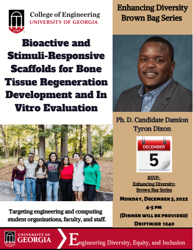 We’re excited to have our most senior graduate student, PhD candidate Damion Dixon, present his research during the College of Engineering Enhancing Diversity Brown Bag Series. Come out on Monday, Dec. 5th at 4pm to hear about his work developing scaffolds for bone tissue engineering!